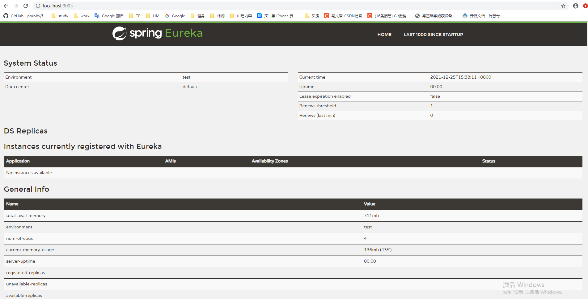 然后启动eurekaServer 模块,在浏览器访问配置文件的端口,出现下面页面即是访问成功!