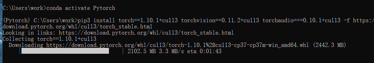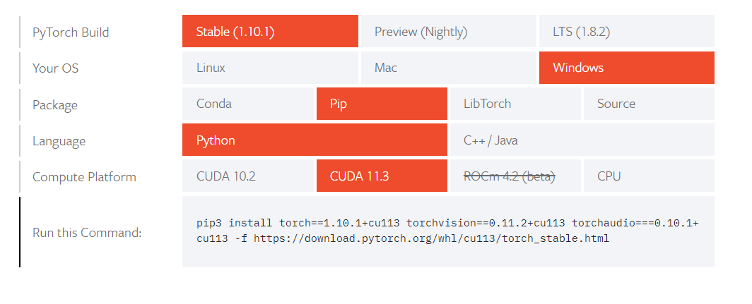 pip3 install torch==1.10.1+cu113 torchvision==0.11.2+cu113 torchaudio===0.10.1+cu113 -f https://download.pytorch.org/whl/cu113/torch_stable.html