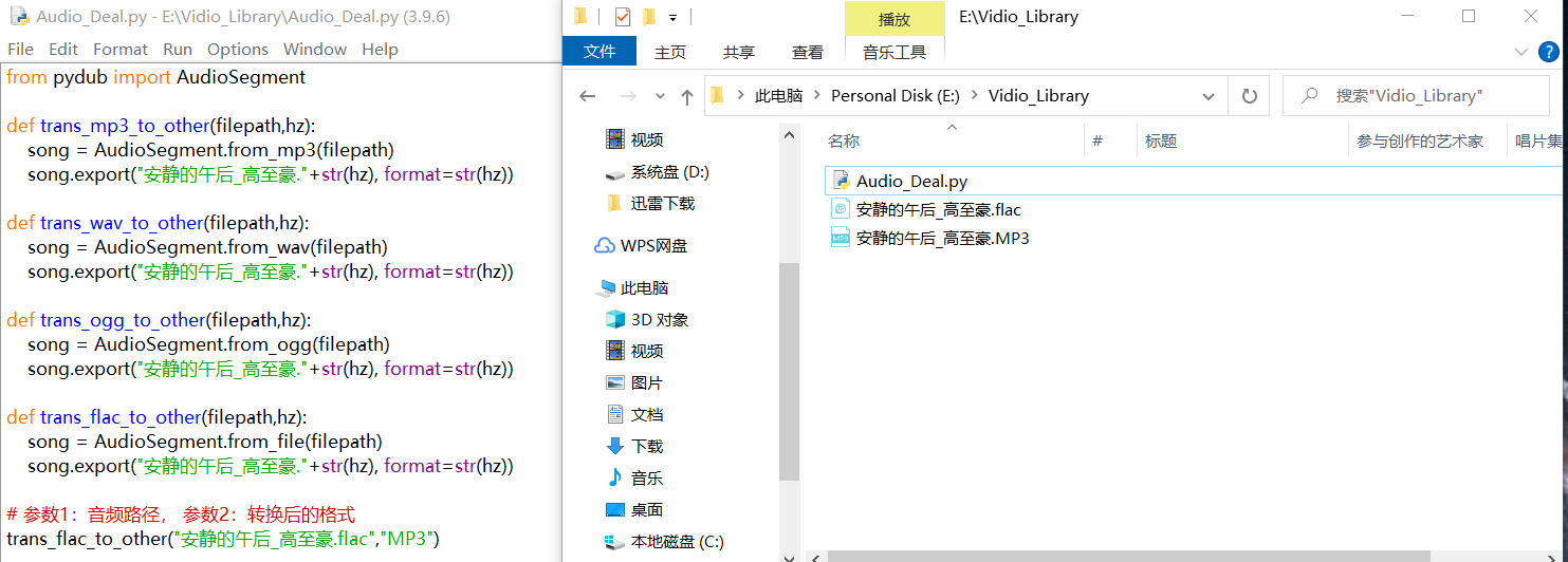 3、输入下方代码(把“安静的午后_高至豪.flac”格式转换为“安静的午后_高至豪.MP3”格式)