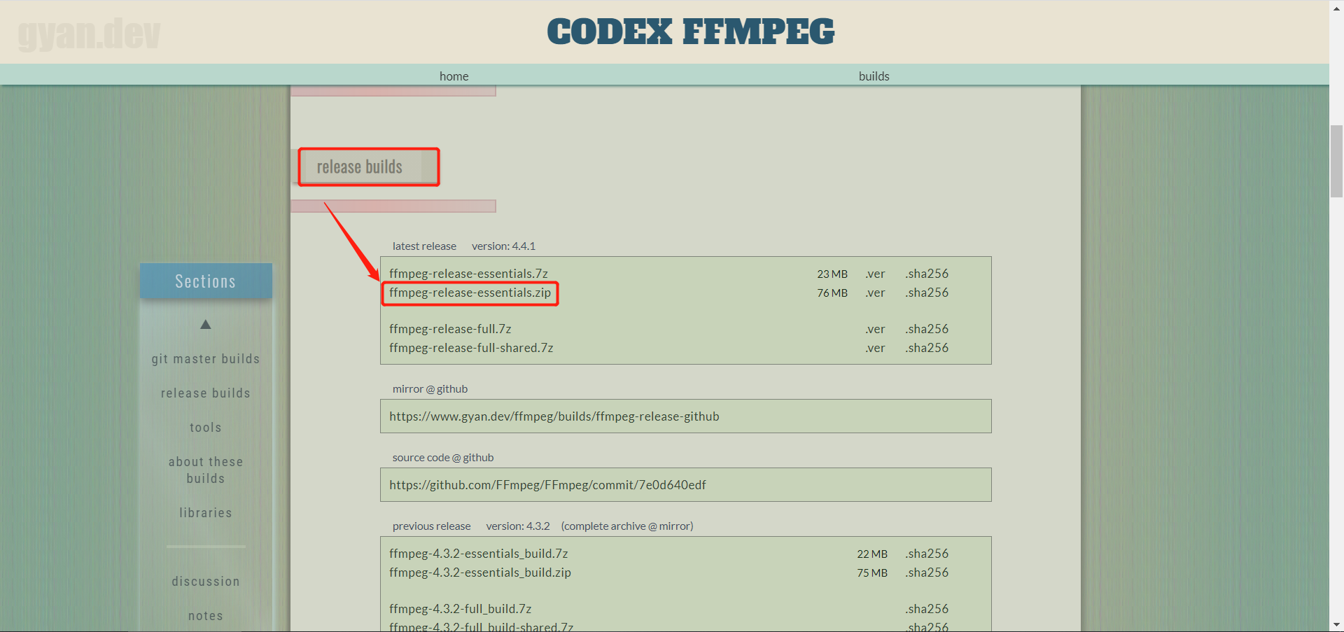 (3)往下拉找到release builds点击ffmpeg-release-essentials.zip下载