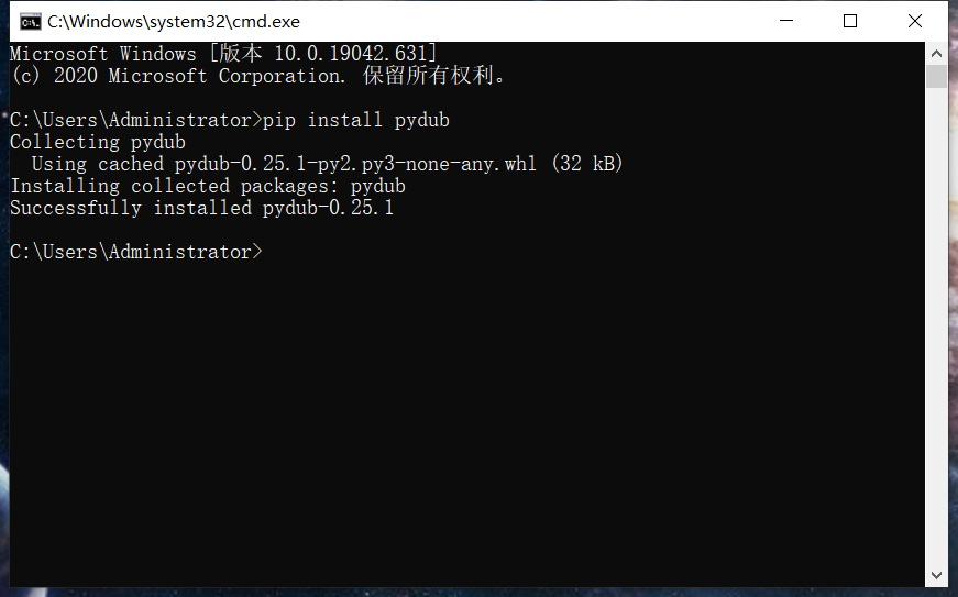 Win+R运行输入cmd进入控制台窗口,输入pip install pydub 回车进行安装