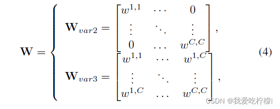 var2采用一个对角矩阵实现参数量少,但是没有通道交互。var3采用全矩阵实现有通道交互但是参数量大。