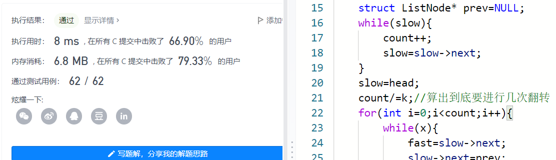 以上是力扣上的一道K个一组翻转单链表的题目。我的解题思路如下: