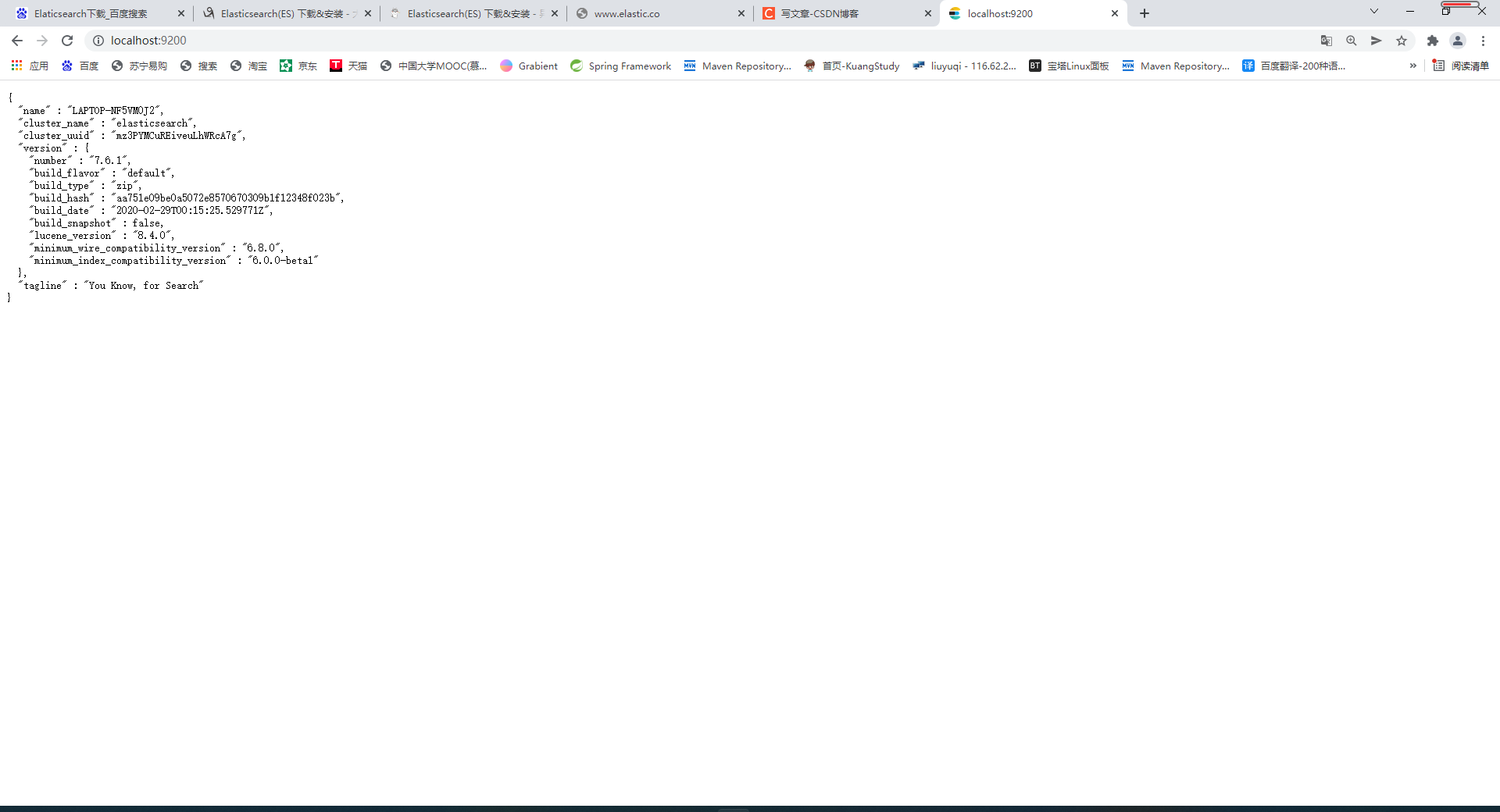 https://www.elastic.co/cn/downloads/elasticsearch得到下载的文件后,在bin目录下打开cmd,start elasticsearch,再用浏览器打开9200端口,出现以下界面代表运行成功。