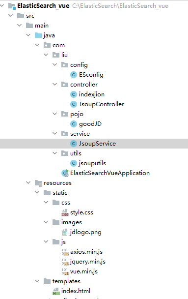 项目的所有文件都如图所示, yaml文件我配置的端口是8081;在用之前得保证你有相关的jsoup和es得maven依赖,上周已经提供。以下是上周的爬虫类utils下的jsoupService