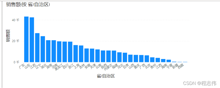 7.在“字段”窗格中, 将“销售额”字段拖到画布上的空白区域, 然后将“省/自治区”字段拖动到“可视化”窗格下半部分的“轴”设置项中, 再选择“簇状柱形图”可视化效果。