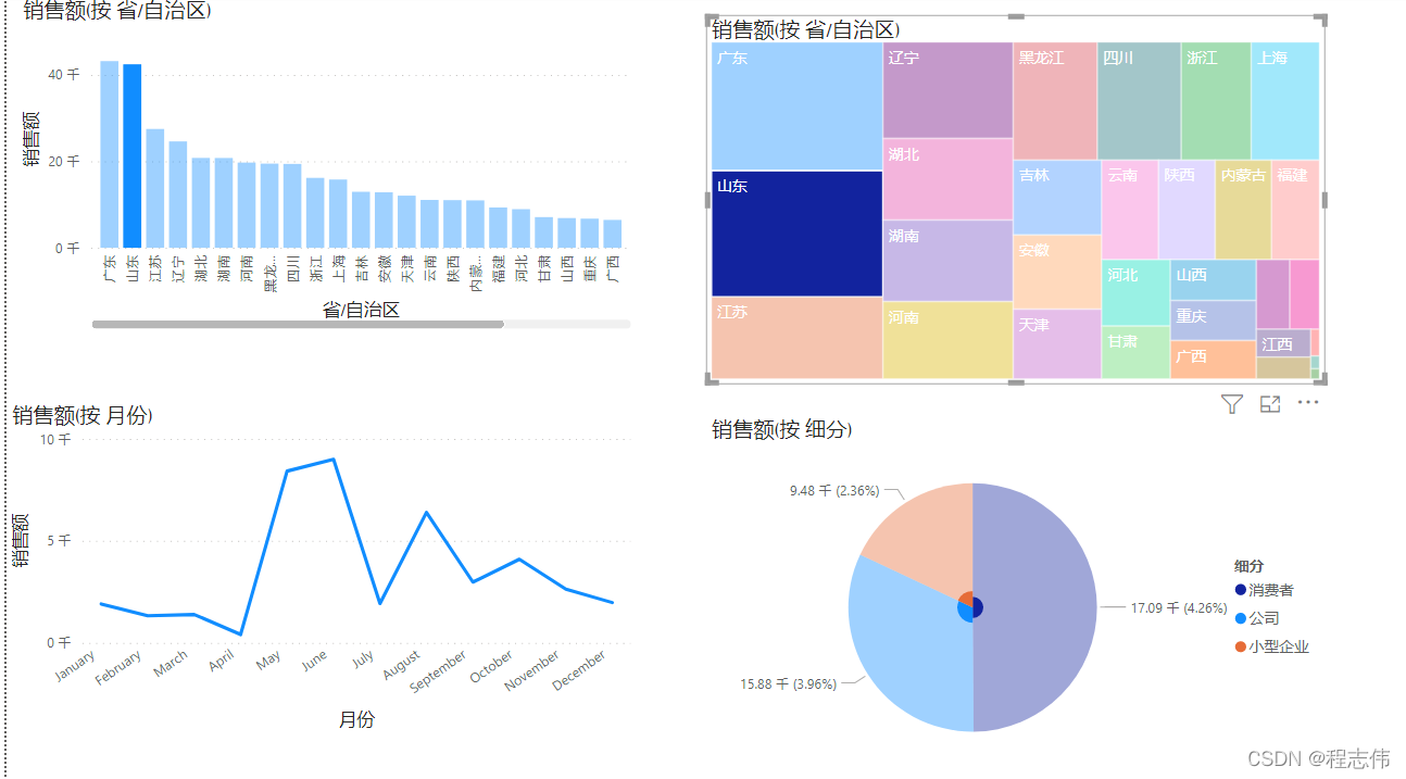 9. 在“字段”窗格中, 将“省/自治区”字段拖动到画布右上角的空白处,再将“销售额”字段拖动到“可视化”窗格下半部分的“值”设置项中, 然后选择“树形图”可视化效果, 树形图上的区域大小和颜色深浅会随着销售额的多少出现相应的变化。