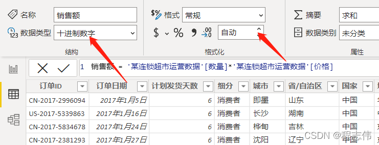 6. 下面修改“销售额”列的数据类型,选择十进制数据,格式常规,小数位数自动。