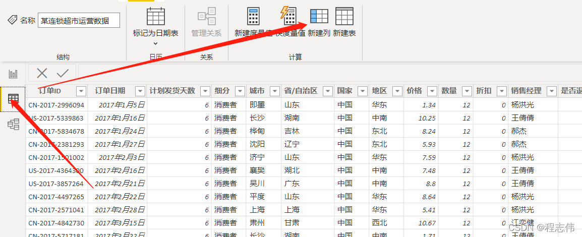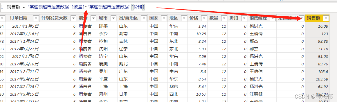 5. 在“自定义列公式”文本框中输入“='某连锁超市运营数据'[数量]*'某连锁超市运营数据'[价格]”, 在“新列名”文本框中输入“销售额”。
