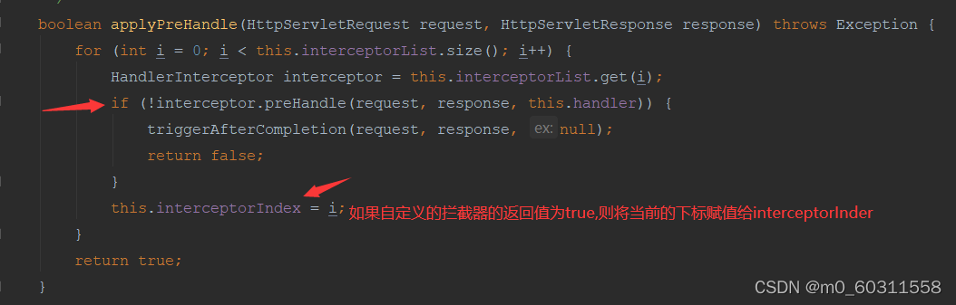 关于拦截器放行的问题 第一种情况:MyHandlerInterceptor1 放行 MyHandlerInterceptor2 放行 MyHandlerInterceptor1 preHandle return true MyHandlerInterceptor2 preHandle return true MyHandlerInterceptor2 postHandle MyHandlerInterceptor1 postHandle MyHandlerInterceptor2 afterCompletion MyHandlerInterceptor1 afterCompletion 第二种情况:MyHandlerInterceptor1 放行 MyHandlerInterceptor2 不放行 MyHandlerInterceptor1 preHandle return true MyHandlerInterceptor2 preHandle return false MyHandlerInterceptor1 afterCompletion 第三种情况:MyHandlerInterceptor1 不放行 MyHandlerInterceptor2 不放行 MyHandlerInterceptor1 preHandle return false