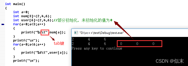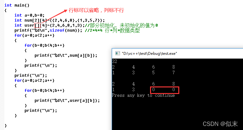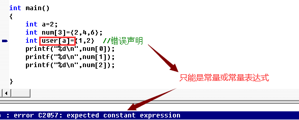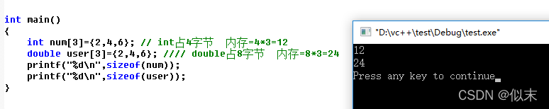 数组:是一组类型一样,有序的数据集合,{a,b,c},数据用花括号括起来,各个数据用逗号隔开。数组所占的内存为数据类型的内存*数组的长度。