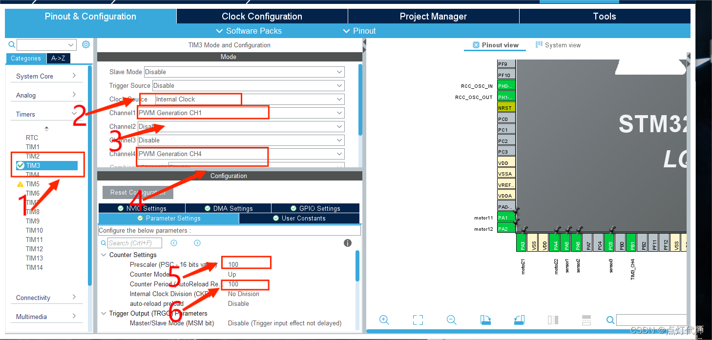 TIM3->CCR1=TIM3->CCR4=80;//两个电机的速度范围(0-100),越大越快。