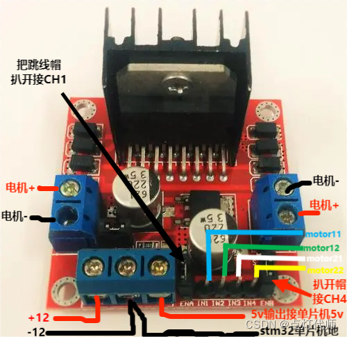 说明:PWM接线把跳线帽扒开接外面引脚 CH1接ENA,CH2接ENB。