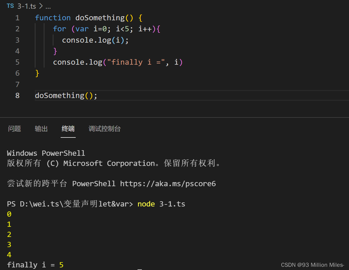 可以看到变量 i 突破语言的区块,也就是在for循环依然存在,只要用var声明变量后,变量就会在函数作用域内持续存在。但是如果把 var 改为 let 就会报错“ cannot find name i ”, 所以使用let 声明变量后,该变量就会有明确的作用域,这样会更加安全。