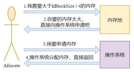 (2)如下图,Allocate 方法向内存池(Arena)申请的内存≥ kBlockSize / 4,那么 Allocate 方法会直接向操作系统申请内存,也即调用操作系统的 new/malloc 方法