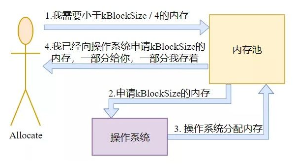 (3)如下图,Allocate 方法向内存池(Arena)申请的内存小于 kBlockSize / 4,如果频繁直接向操作系统申请这么小的内存,性能上不划算,所以内存池会向操作系统申请 kBlockSize 大小的内存,然后分配给 Allocate 方法所需要的 bytes 大小内存,自己保留 kBlockSize - bytes 的内存(该保留的内存也即剩余的内存,使用alloc_bytes_remaining_ 成员变量记录大小,使用 alloc_ptr_成员变量记录地址)