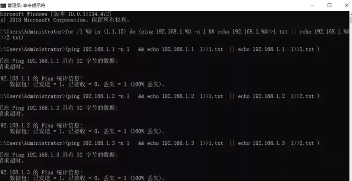 上面的命令虽然能批量ping 地址,但是上面代码在命令行窗口显示数量多的时候看起来也很麻烦,那么我们再升级一下,用下面的代码。