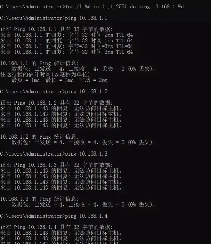 当输入批量命令后,那么它就自动把网段内所有的ip地址都ping完为止。