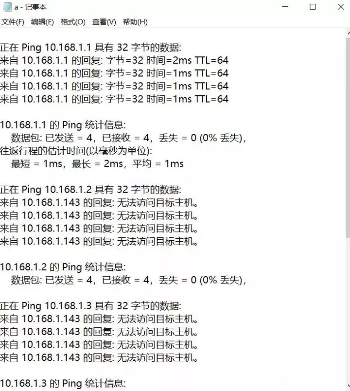 这样就会把结果导入的a.txt文件中,全部IP检查完成后打开a.txt搜索“TTL=”包含它的就是通的地址,没有包含“TTL=”的地址就是不通的。
