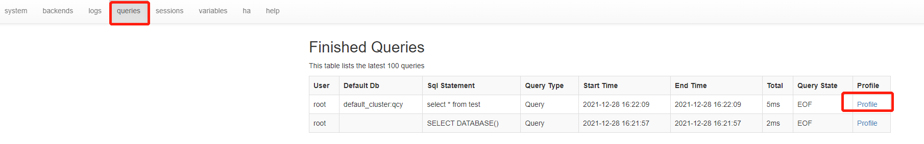 如上设置打开profile上报后,打开fe的http界面(http://ip:8030),如下点击queries后,点击相应sql后的profile即可查看对应信息。
