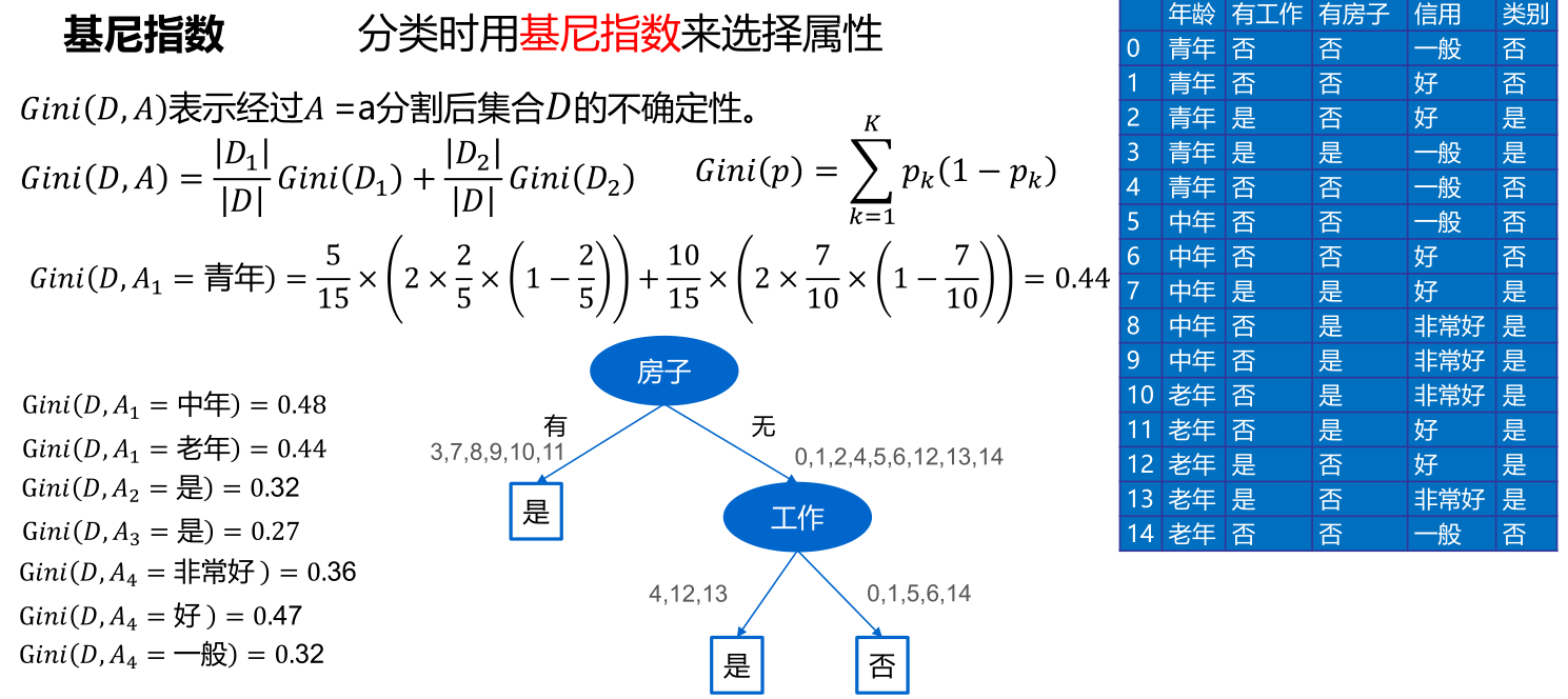 H(D|A_{1}=中年)=-\sum^{k}_{k=1}\frac{|C_{k}|}{|D|}log_{2}\frac{|C_{k}|}{|D|}=-\frac{2}{5}log_{2}\frac{2}{5}-\frac{3}{5}log_{2}\frac{3}{5}=0.971