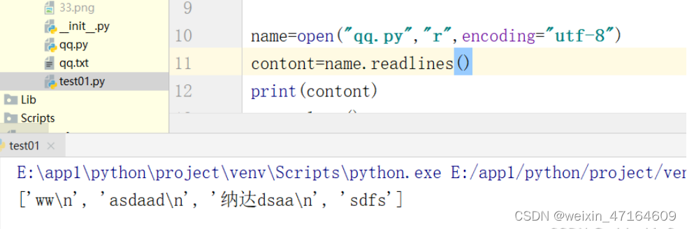 3 读数据(readlines) 就像read没有参数时一样,readlines可以按照行的方式把整个文件中的内容进行一次性读取,并且返 回的是一个列表,其中每一行的数据为一个元素