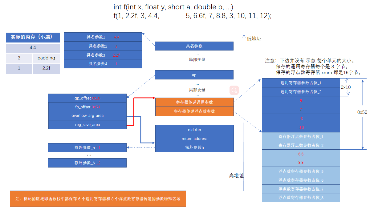 2、只有通过寄存器传递的可变参数,才会赋值到栈上这块特殊的区域,毕竟具名参数都复制到了栈顶。多余的参数(6个之外的整形参数,8个之外的浮点参数)都是在 call指令之前入栈,也就是本函数作为被调用者,在调用者的栈上,而且这些直接通过栈传递的整形都是占用 8 个字节,浮点型,无论是单精度还是双精度也是占用 8 个字节。