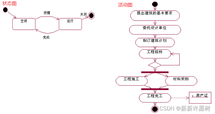 两者最大的区别是:状态图侧重于描述行为的结果,而活动图侧重描述行为的动作。其次活动图可描述并发行为,而状态图不能。