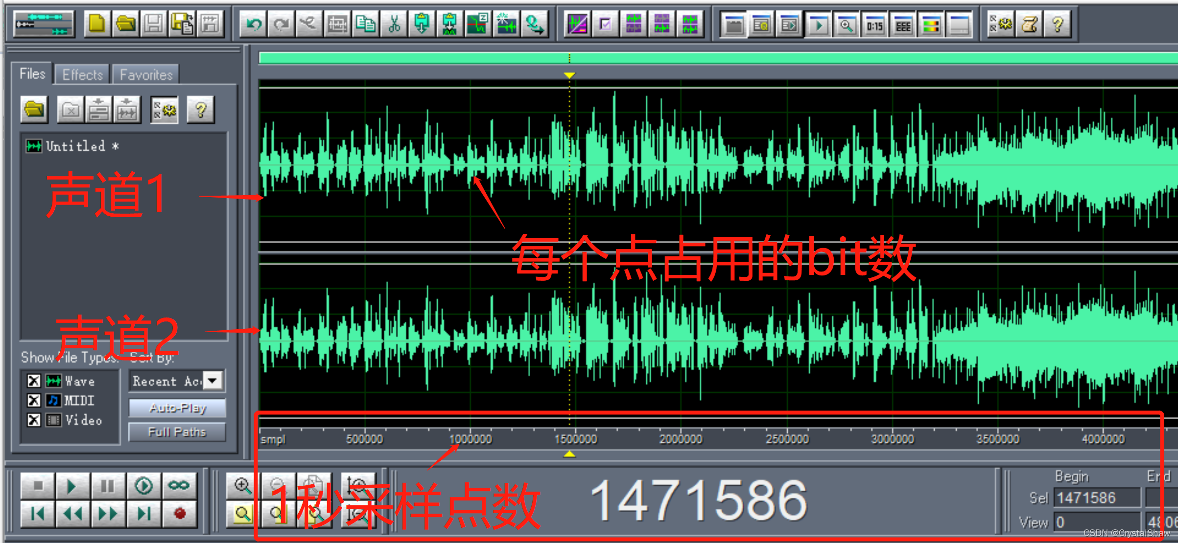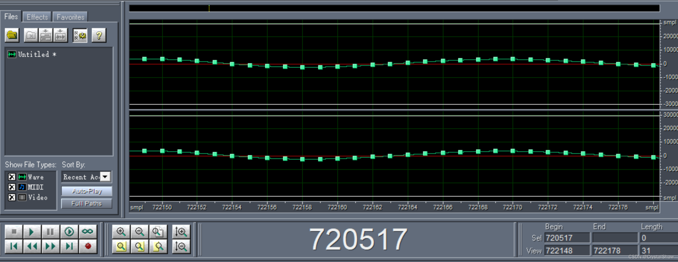 2、采样频率(nb_samples):每秒钟取得声音样本的次数。如下图所示,把音频文件放大,实际上都是一个一个的点,一秒钟有多少个横坐标的点,就是该音频的采样频率。