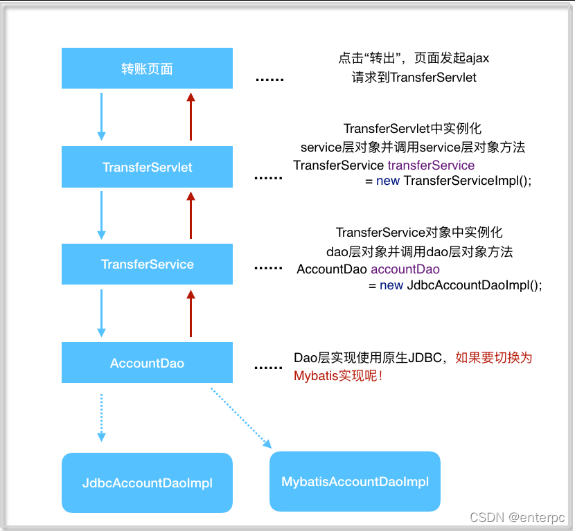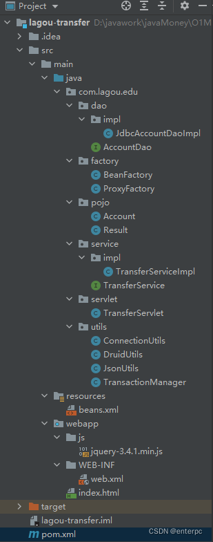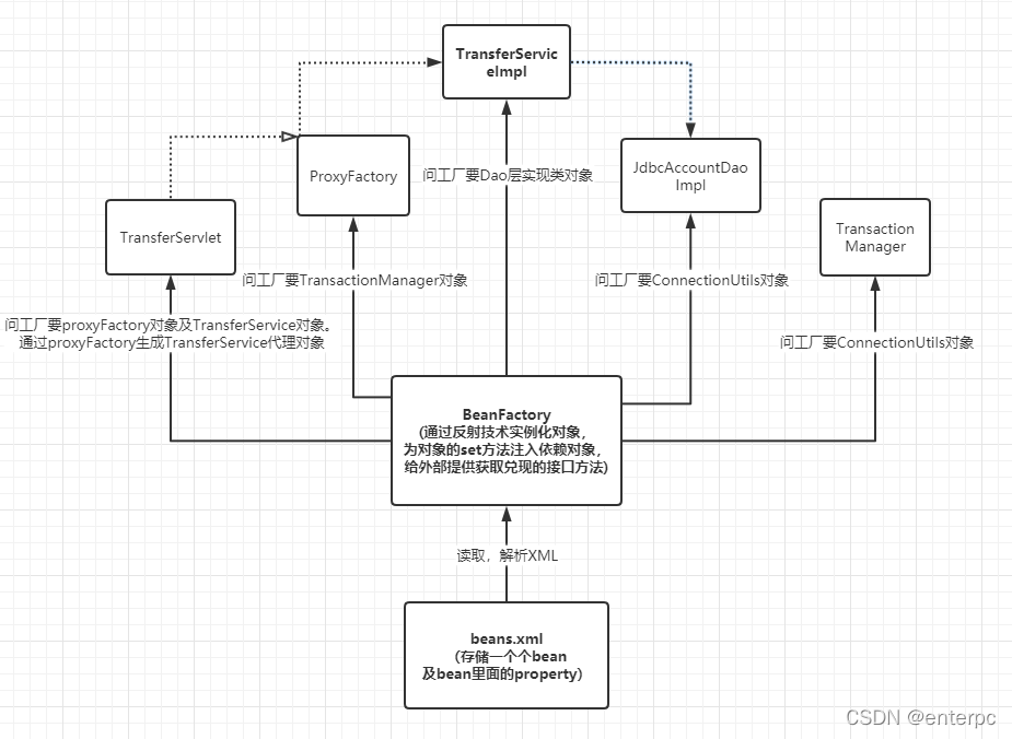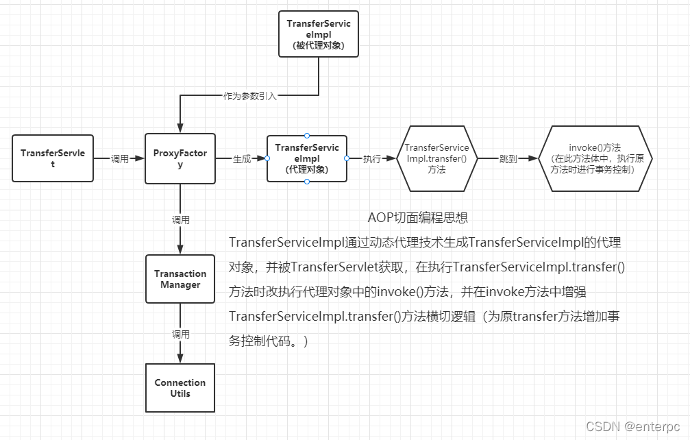 (3)创建ProxyFactory工厂用来生产TransferServiceImpl代理对象,并在生产代理对象过程中强化被代理对象的业务逻辑,从切面增加事务控制。而Servlet则通过ProxyFactory获取到增强的TransferServiceImpl被代理对象。