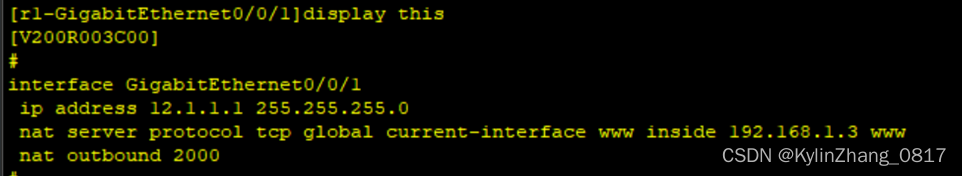 [r1-GigabitEthernet0/0/1]nat server protocol tcp global current-interface 80 ins