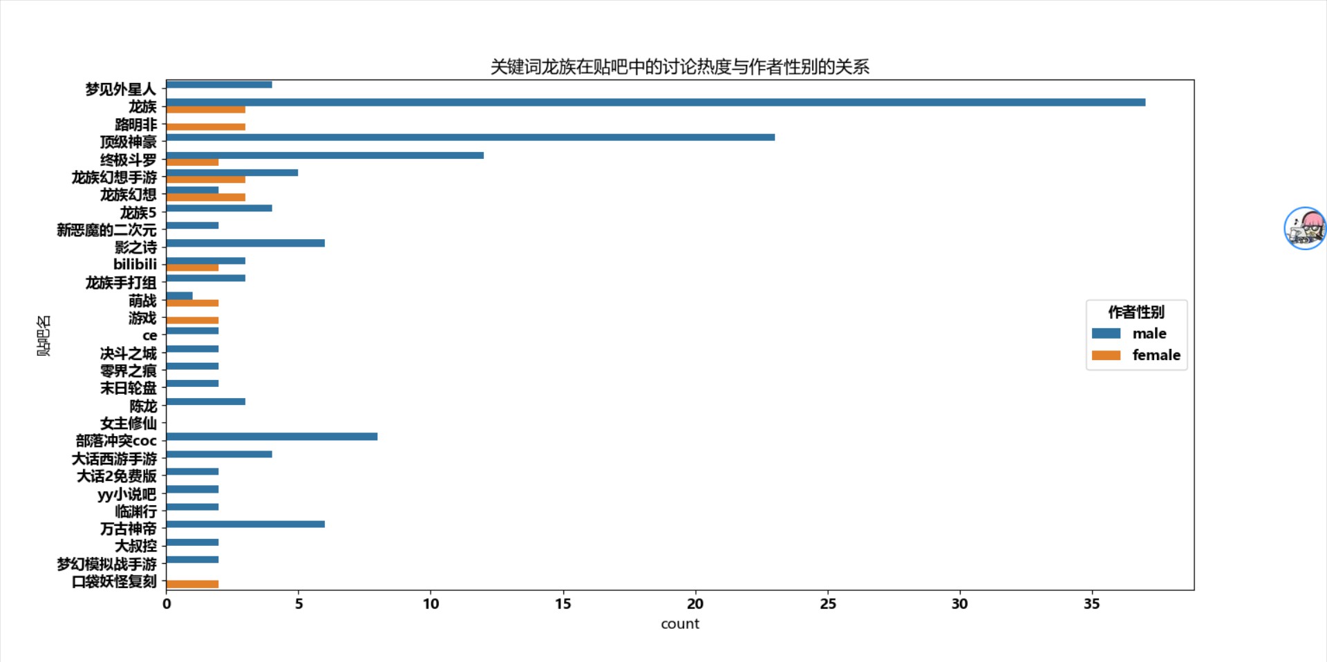 百度贴吧。准确地来说是百度贴吧某关键词搜索下的所有帖子的楼主的信息,包括:{用户名、性别、吧龄};和帖子名与帖子所属的贴吧。最后,我们会将这些数据用Seaborn可视化地展现出来。