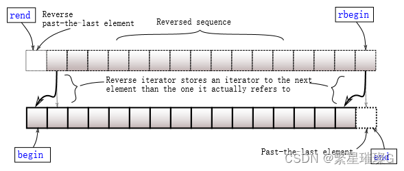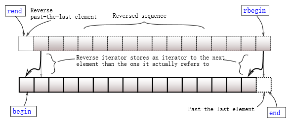 返回指向逆向容器末元素后一元素的逆向迭代器。它对应非逆向容器首元素的前一元素。此元素表现为占位符,试图访问它导致未定义行为。