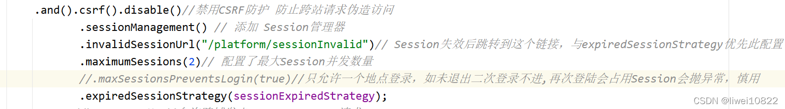 .invalidSessionUrl("/platform/sessionInvalid")// Session失效后跳转到这个链接,与expiredSessionStrategy优先此配置