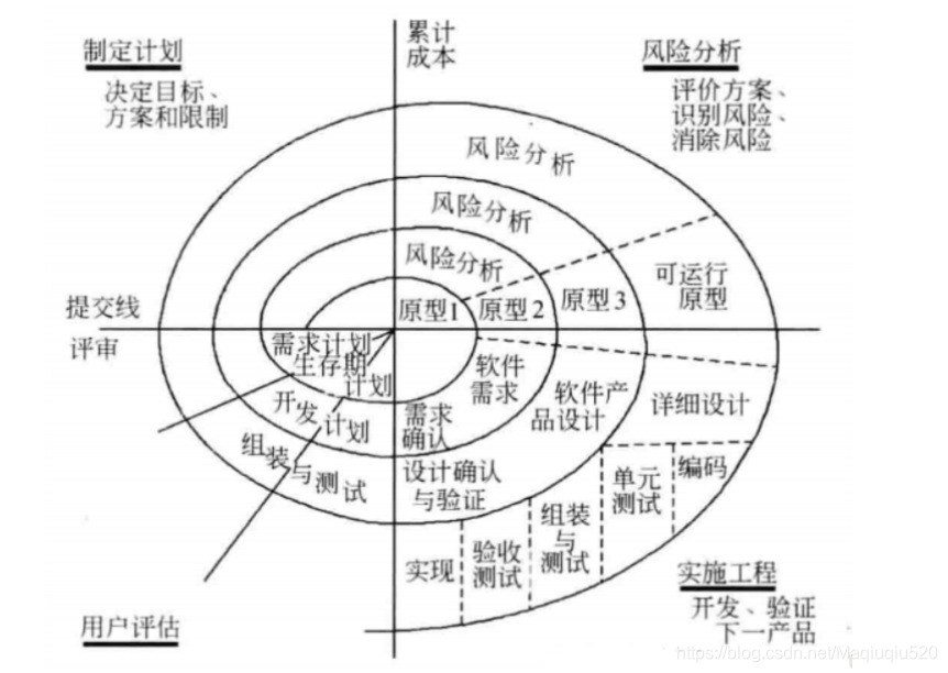 **2>演化型模型之螺旋模型:**将瀑布模型与演化模型结合起来,加入了两种模型均忽略的风险分析,弥补了这两种模型的不足。螺旋模型将开发过程分为几个螺旋周期,每个螺旋周期大致和瀑布模型相符合:
